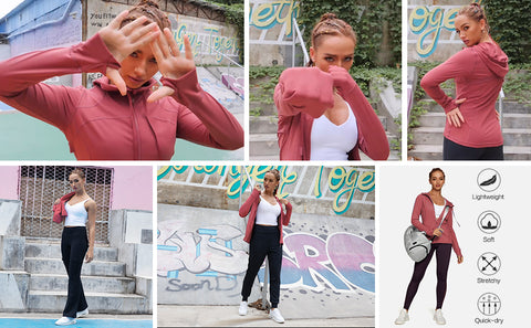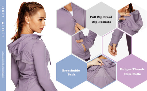- [FRONT POCKETS AND THUMBHOLES] Our sports jacket with zipper was designed for the active woman on the move. Don't want to carrry a bulky purse? Not to worry, this women’s performance jacket has two front pockets to store your wallet, smartphone and keys! This athletic jacket also offers thumb holes to increase hand coverage and warmth during the chilly seaons.